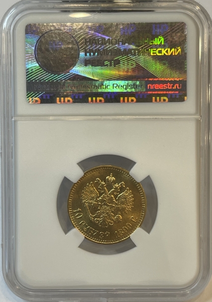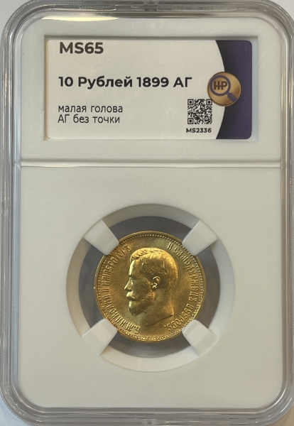Золотая монета 10 рублей Николай II 1899г.,АГ БЕЗ ТОЧКИ, в слабе ННР MS 65