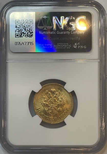 Золотая монета 10 рублей Николай II 1899г.,АГ, в слабе NGC MS 64