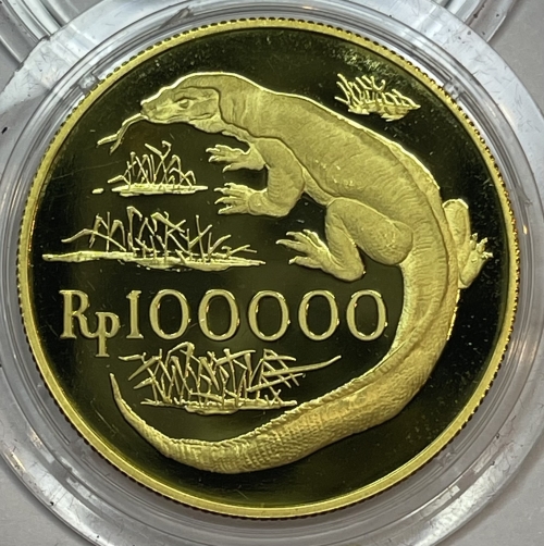 Золотая монета 100 000 рупий "Комодорский варан" 1974г., Au 900, 33,44г., Индонезия