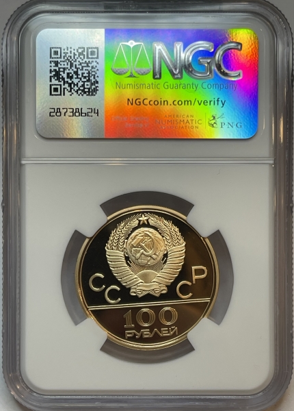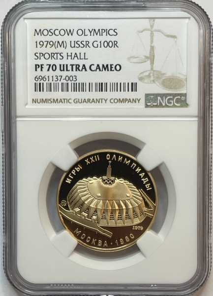 Золотая монета 100 рублей "Спортивный зал Дружба" Олимпиада 80, 1979г., в слабе NGC PROOF 70 ULTRA CAMEO