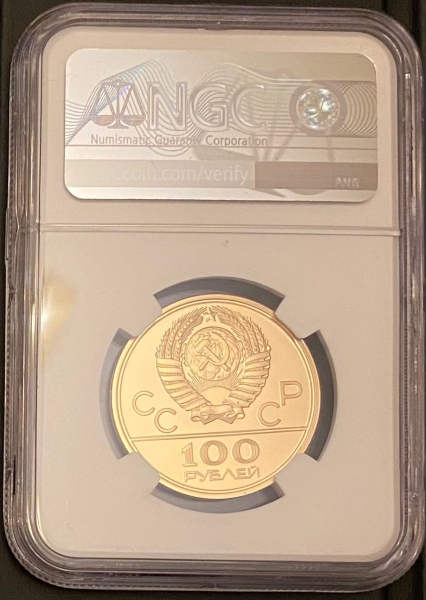 Золотая монета 100 рублей "Велотрек" Олимпиада 80. 1979г. ЛМД в слабе NGC MS 69