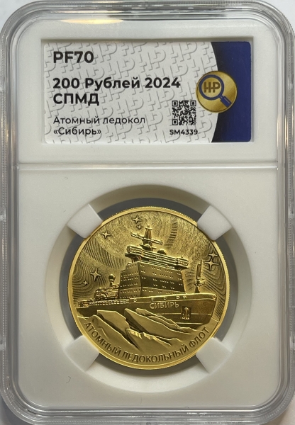 Золотая монета 200 рублей "Ледокол Сибирь" 31,1 г, 999 проба в слабе ННР PROOF 70
