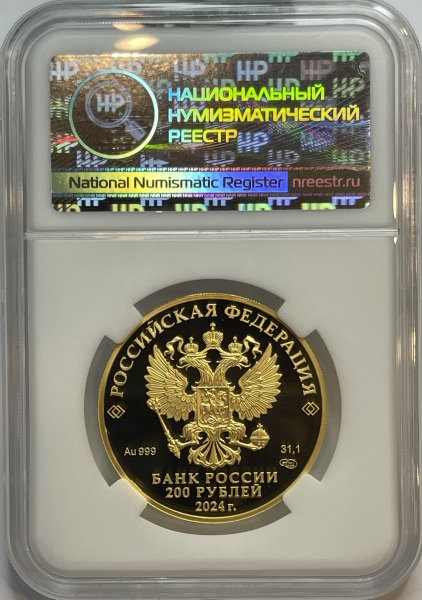 рельефное изображение Государственного герба Российской Федерации, над ним вдоль канта – надпись полукругом «РОССИЙСКАЯ ФЕДЕРАЦИЯ», обрамленная с обеих сторон сдвоенными ромбами, под гербом слева – обозначения драгоценного металла и пробы сплава, справа – содержание химически чистого металла и товарный знак монетного двора, внизу в центре в три строки – надпись «БАНК РОССИИ», номинал монеты «200 РУБЛЕЙ», год выпуска «2024 г.».