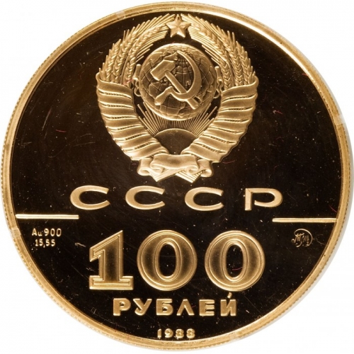 Сверху герб СССР с 15 витками ленты, под ним буквы «СССР», ниже слева и справа черта, под чертой слева химическое обозначение «Au» и проба «900» металла из которого сделана монета, под ними чистый вес драгоценного металла «15,55», под чертой справа монограмма монетного двора «ММД», ниже обозначение достоинства монеты цифра «100» и ниже слово «РУБЛЕЙ», внизу у канта год выпуска монеты «1988».