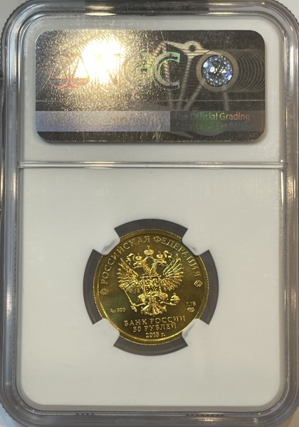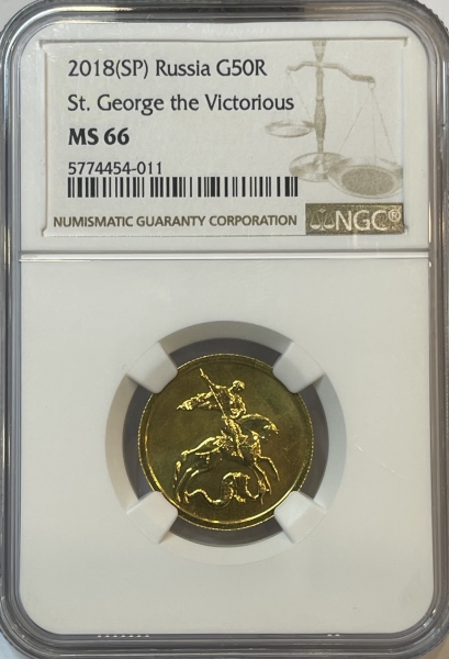 Золотая монета 50 рублей "Георгий Победоносец" СПМД 2018г., Au 999, в слабе NGC MS 66