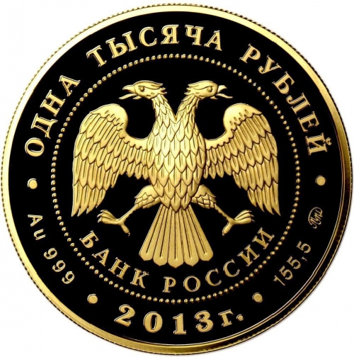 в центре - эмблема Банка России (двуглавый орёл с опущенными крыльями, под ним - надпись полукругом "БАНК РОССИИ"), обрамленная кругом из точек и надписями по кругу - вверху: "ОДНА ТЫСЯЧА РУБЛЕЙ", внизу: слева - обозначения драгоценного металла и пробы сплава, в центре - дата выпуска "2013 г.", справа - содержание химически чистого металла и товарный знак монетного двора.